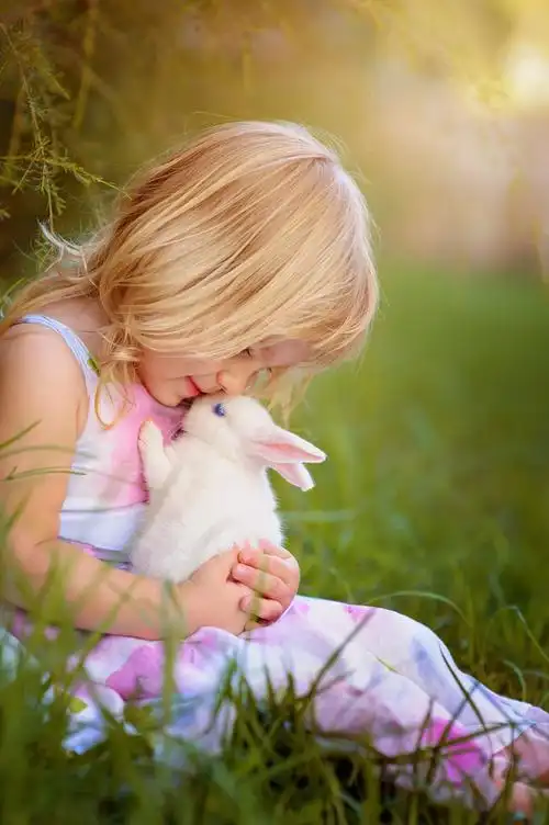 可爱的小女孩和兔子在绿草背景下过复活节