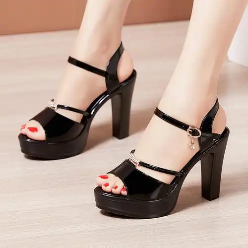 高跟粗跟凉鞋女2020夏季新款厚底防水台漆皮一字扣高跟鞋女式凉鞋
