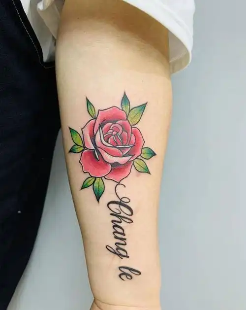 做照明工程师的酆小姐小臂玫瑰纹身图案