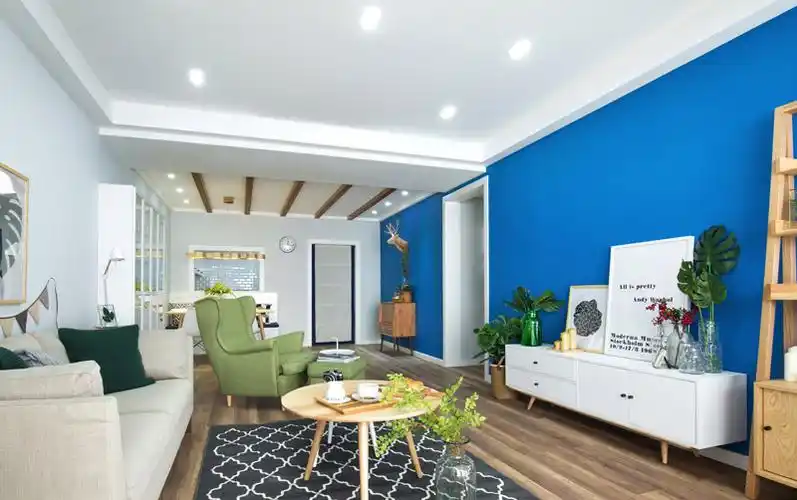 客厅边几饰品墙面蓝色底色,搭配白色金属装饰层板.