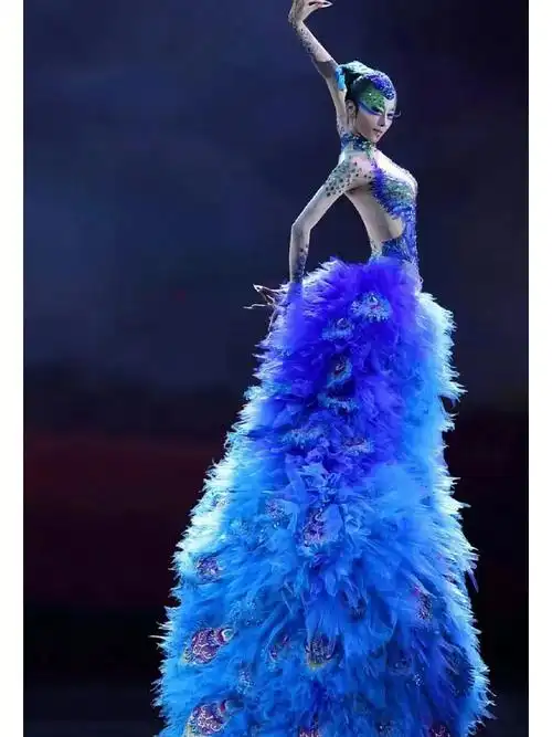傣族女孔雀女羽毛演出服装定制,蓝色经典民族舞蹈服装设计!