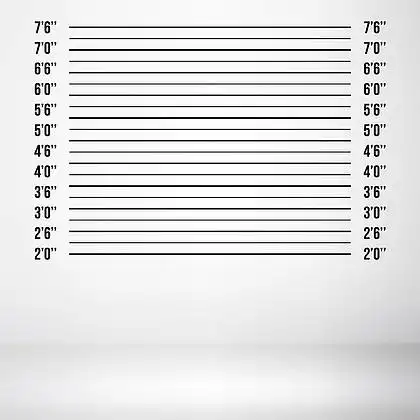 他穿着囚徒橙色连体衣,举着标语牌.背景中的身高图表.