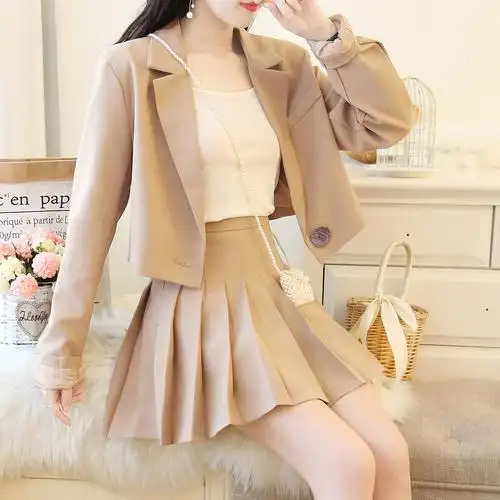 3169小香风气质翻领西装短外套 吊带背心 百褶半身裙短裙三件套
