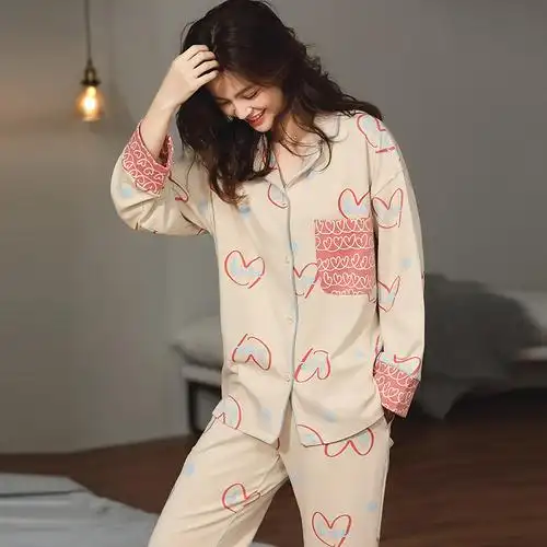 甜妹子 女士睡衣春秋纯棉长袖翻领开衫秋冬薄款套装