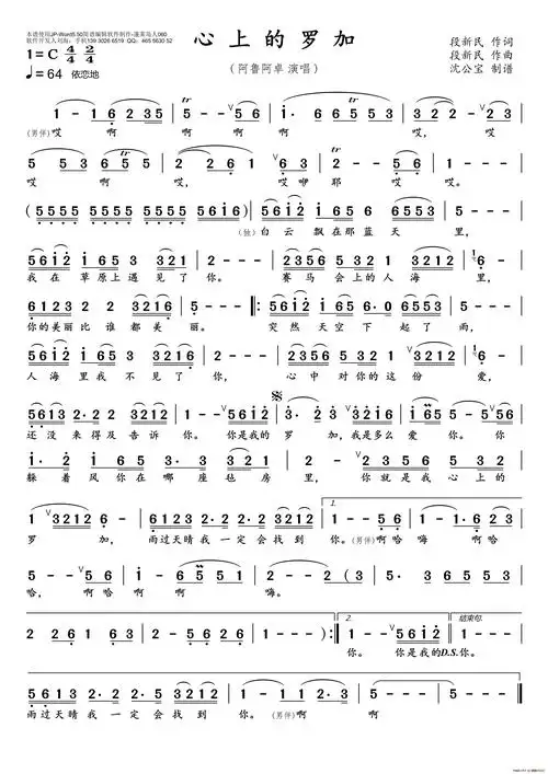 心上的罗加 阿鲁阿卓 歌谱 简谱