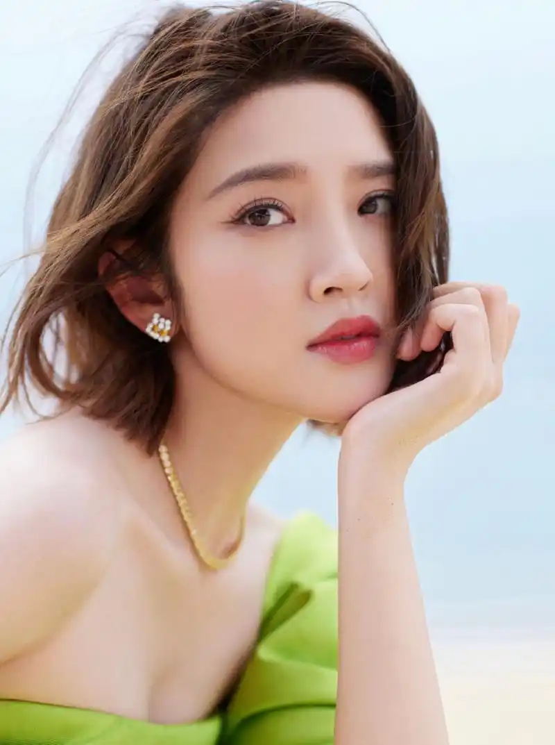 唐艺昕# 一袭绿色抹胸溜肩开叉裙,雪肤玉貌的容颜,白皙细嫩的肩颈线