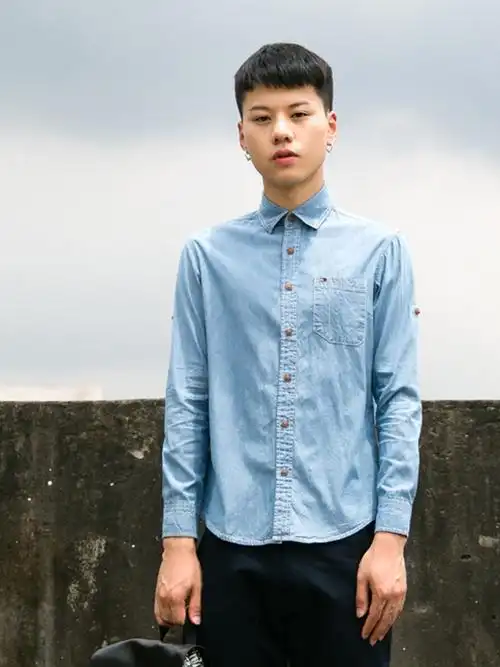 纯色水洗牛仔衬衫 搭配黑色裤子 休闲 学院风