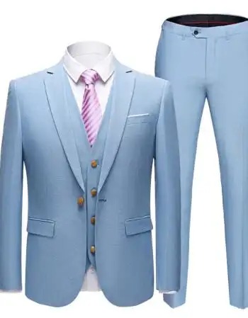 套装男士休闲西装男三件套新郎结婚礼服英伦浅蓝韩版修身四季 浅蓝色