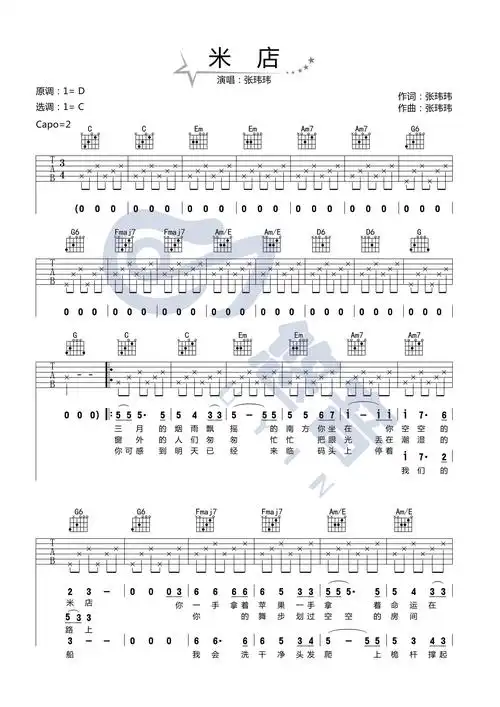 米店吉他谱_张玮玮_《米店》c调六线谱_吉他弹唱教学 - 吉他屋