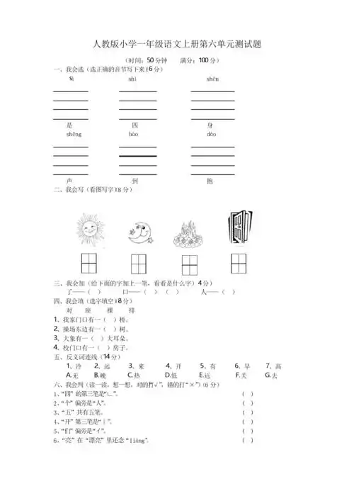 人教版小学一年级语文上册第六单元测试题.docx 2页