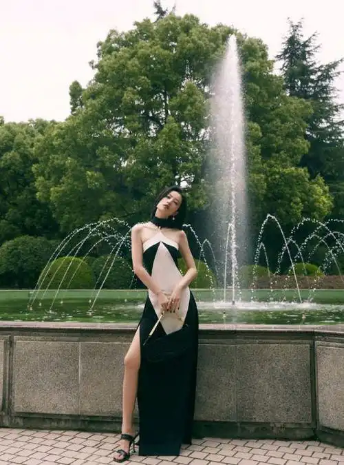 的周雨彤,身穿一条黑白拼接礼裙,高开叉设计露出一双白皙而修长的美腿