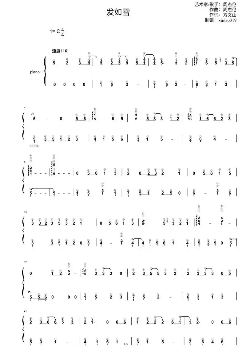 周杰伦《发如雪》c调 简谱 指法.#钢琴谱 - 抖音