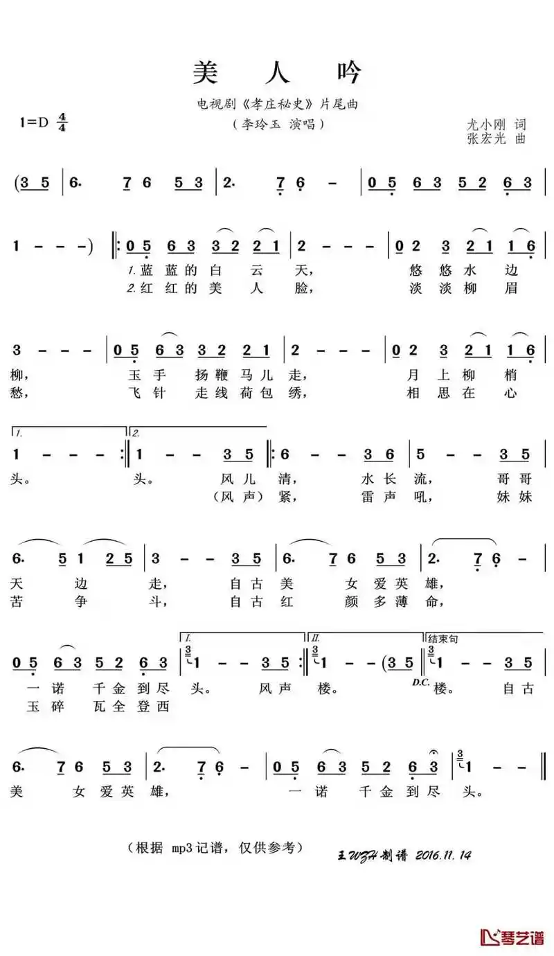 美人吟智能简谱电视剧《孝庄秘史》片尾曲 李玲玉演唱-苍强曲谱