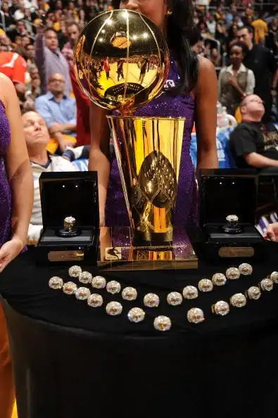 图文湖人庆祝队史第15冠总冠军奖杯配戒指