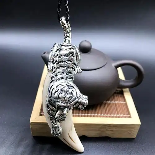 厂家直销精美仿古做旧骨雕牙雕挂件白铜老虎头镶牙齿吊坠挂饰