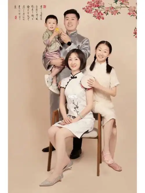 中式工笔画一家四口全家福