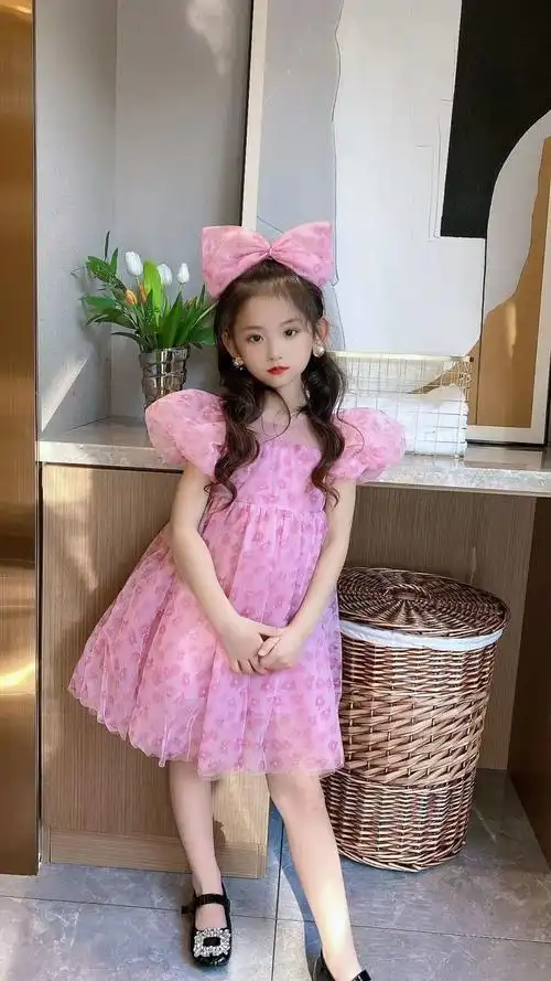 女童新款连衣裙小女孩洋气粉色3岁网纱蓬蓬裙女宝夏装超仙公主裙