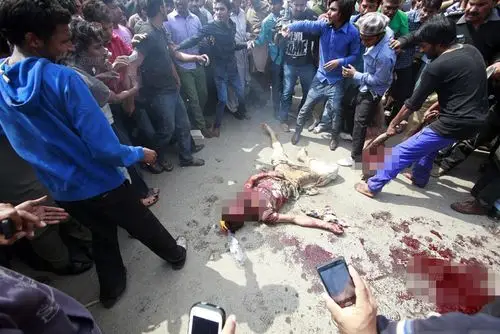 血腥慎入:巴基斯坦民众街头烧死两恐袭嫌犯