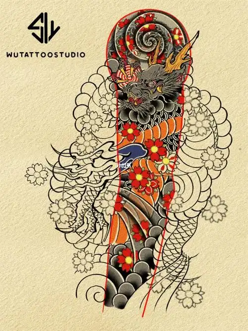 慎吾日式花臂龙樱花传统纹身手稿