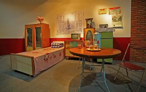 这是复原的80年代的家庭陈设,水磨石地面,蓝色的墙裙,白色的墙面,日光