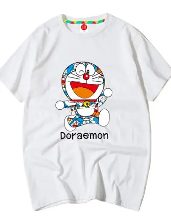 小清新t恤女短袖夏季宽松学生情侣卡通可爱叮当猫衣服定制 白色-彩色