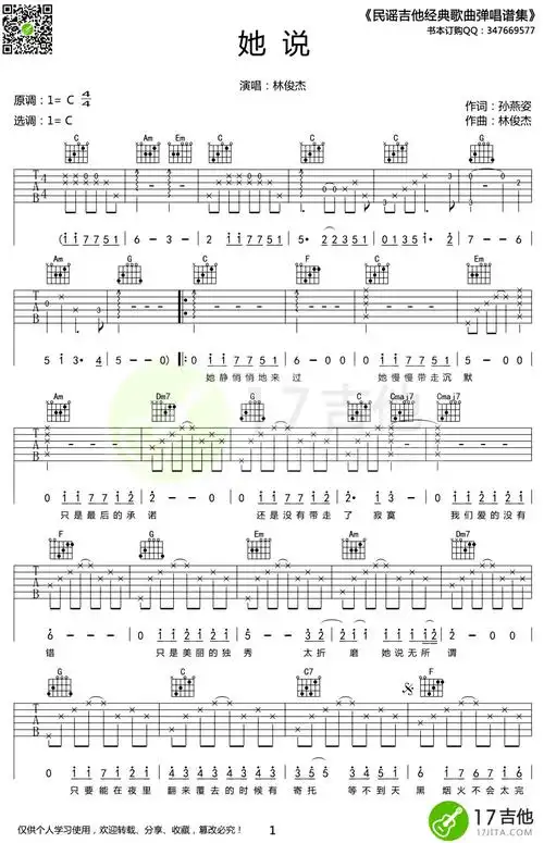 林俊杰《她说》吉他谱 c调简单版 弹唱六线谱插图