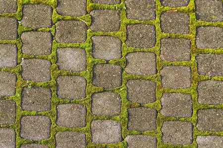 丝质苔藓在瓷砖铺装之间向阳光照射照片