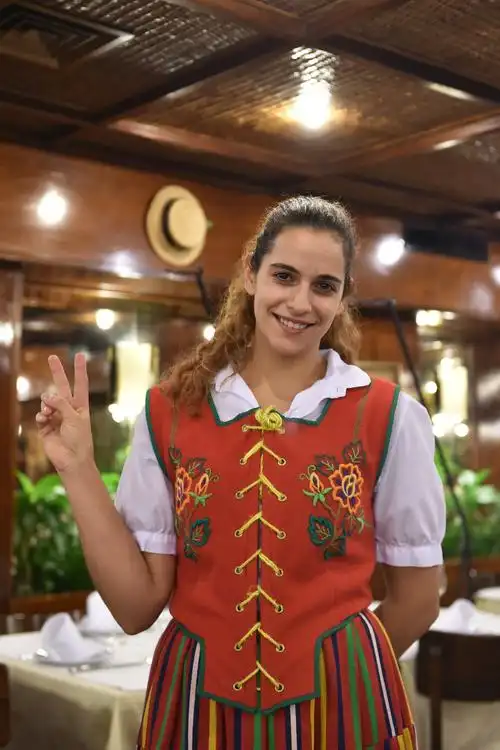 在葡萄牙波尔图,一个金发长发绺的年轻美丽的女人在杜罗河对岸的多姆