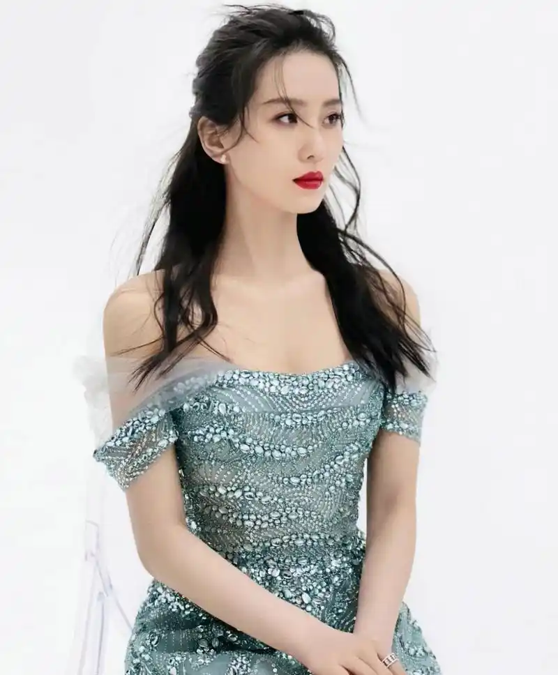 刘诗诗水蓝色一字领不规则镶钻纱裙真的太犯规了