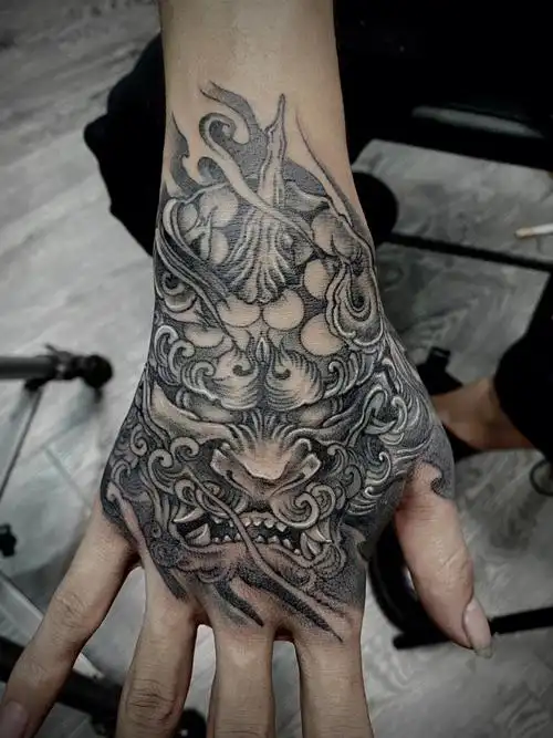 手背唐狮整图与手描线稿.#纹身刺青tattoo #新传统纹身