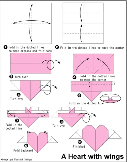 diy趣味手工折纸带翅膀的心详细图解心花怒放爱心的折法折纸心花怒放