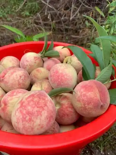 桃树下落满了熟透掉落的桃子一个个色泽鲜红的狗血桃挂在枝头在保安