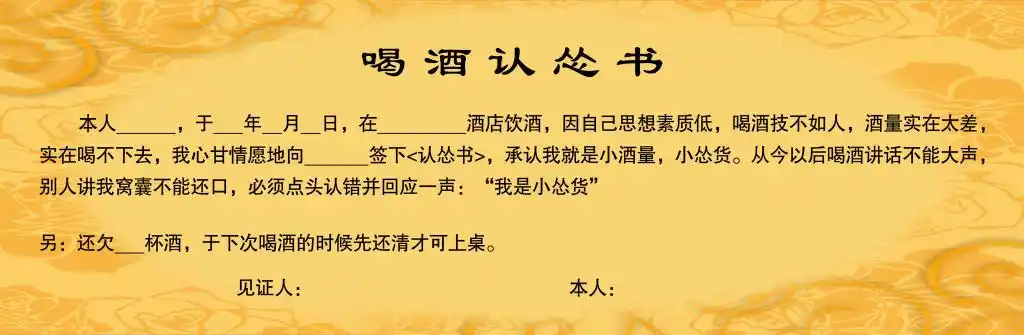 喝酒投降书本人于年月日在喝酒我心甘情愿签下投降书承认我酒量差从此