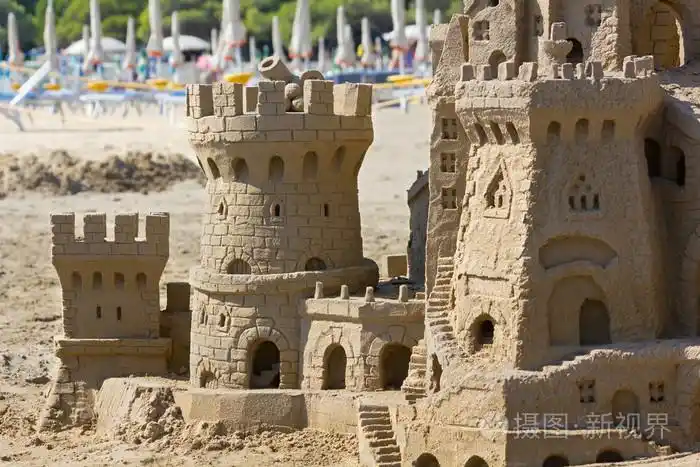 海滩上的沙子城堡,sand castle on beach with water from wave