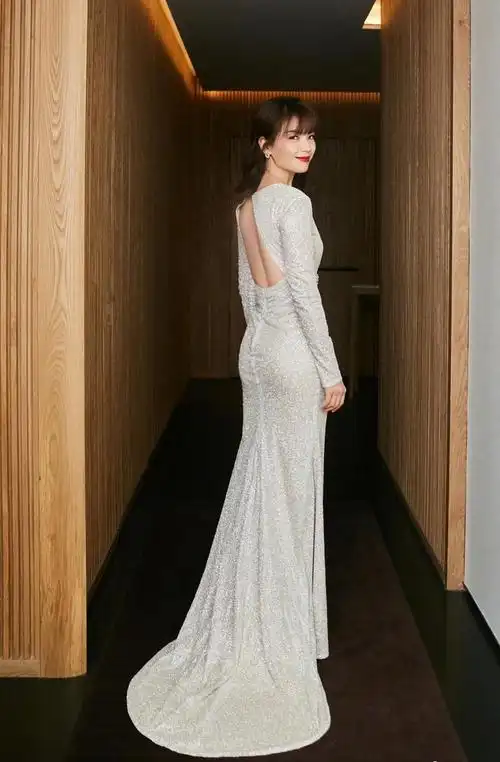 裙子下半身的修身设计正好展现了她丰满的臀部,留着中长发的刘涛自信