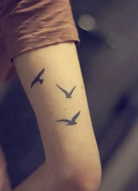 胳膊上三只纯黑色海鸟简约纹身图案