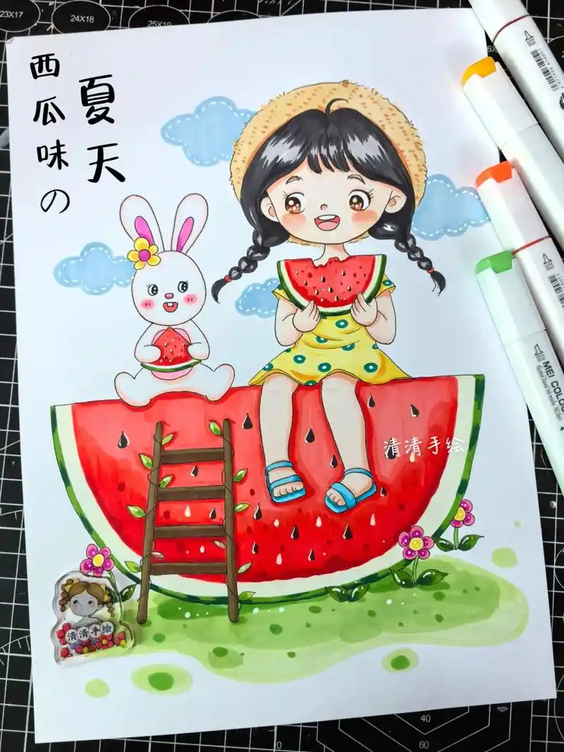 夏天吃西瓜清凉一夏手绘儿童画