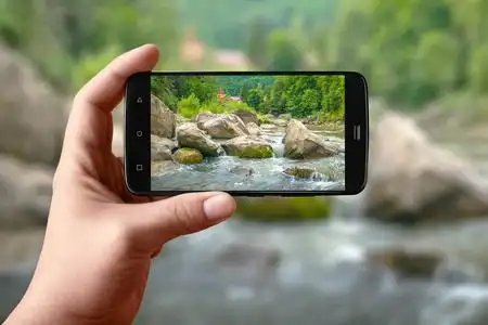 个手持智能手机在屏幕上拍摄自然.在社交网络上发布的山河照片.