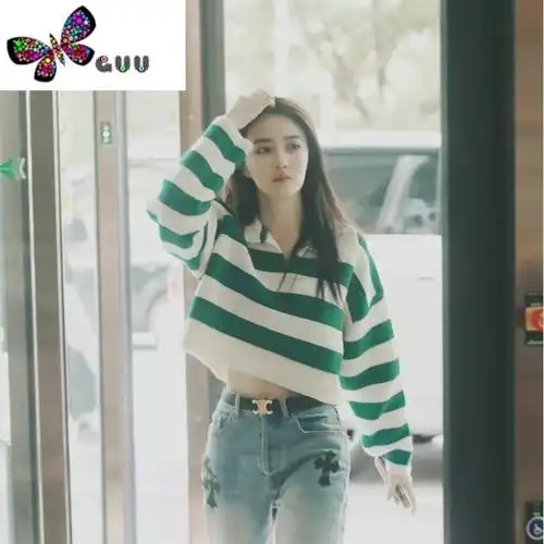 语娄徐璐同款绿色条纹针织v领polo衫女2023秋新短款毛衣宽松长袖上衣