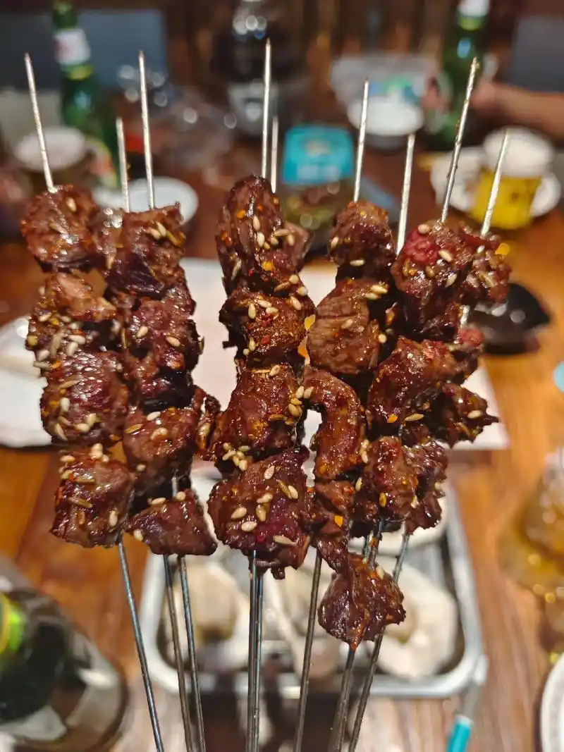 桌上有两串烤鸡心 烤鸡心
