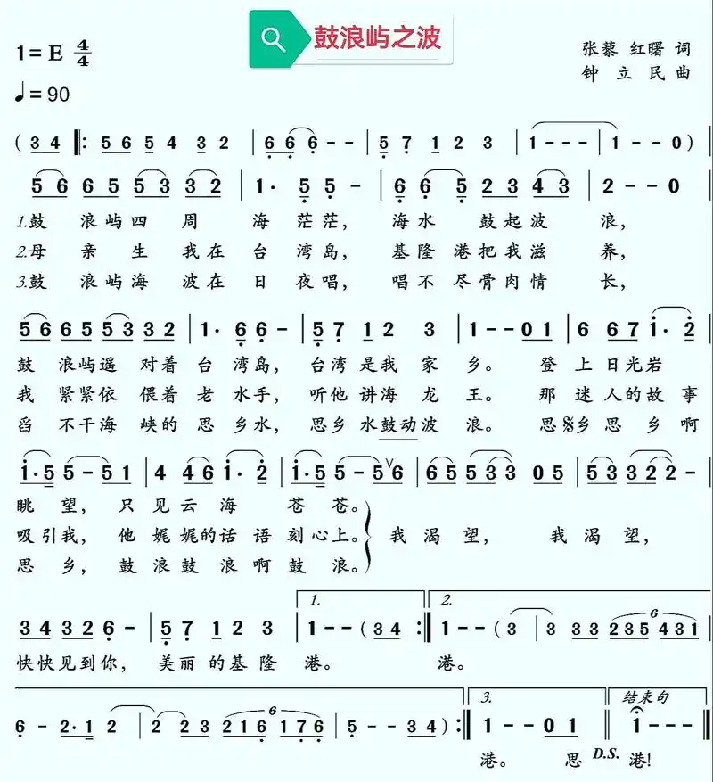 《鼓浪屿之波》简谱 张黎作词 红曙作词 钟立民作曲 吴梦言演唱