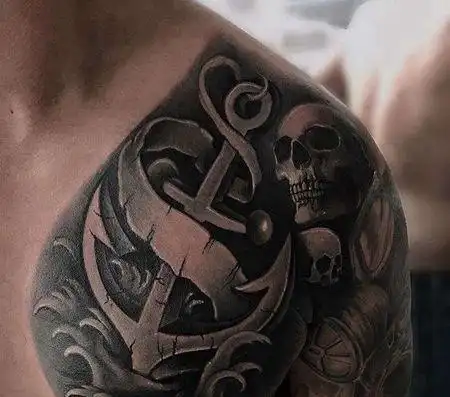 写实前胸船锚骷髅纹身图案