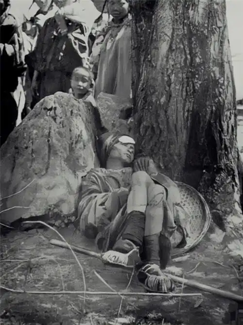 清末老照片,豪绅小老婆坐板凳愁眉不展,犯人街头戴脚链流放千里