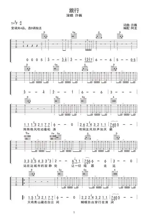 许巍旅行吉他谱d调吉他弹唱谱