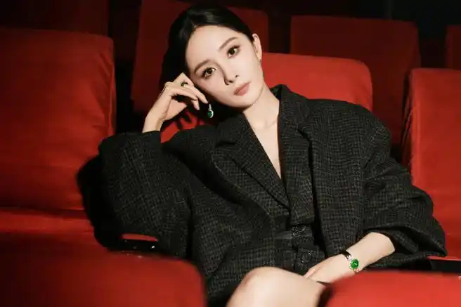 杨幂超话黑色西装搭配复古翡翠,果敢大气,男装穿出女王范!