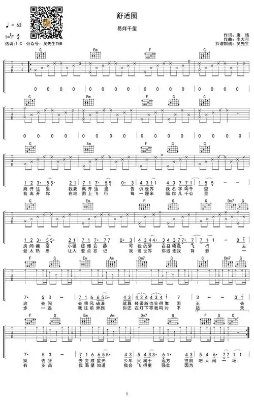 舒适圈吉他谱易烊千玺c调弹唱谱图片谱