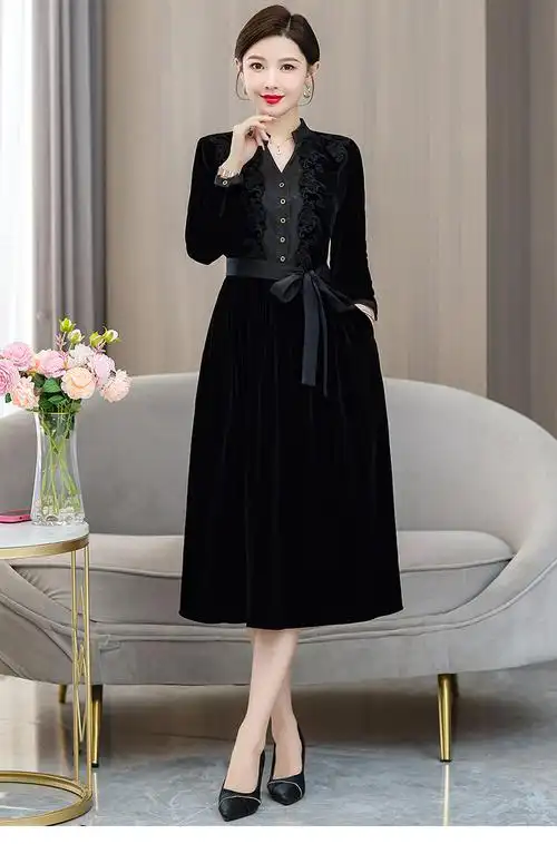 真丝丝绒连衣裙女2024年秋新款法式轻奢香云纱拼接桑蚕丝复古长裙
