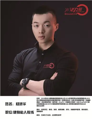 杨添华 职位:健身私人教练 资质:2014年ibfa国际高级健身教练认