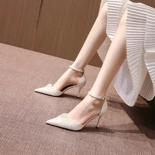 白色高跟鞋女小众气质2022春夏季新款珍珠一字带扣单鞋女细跟尖头