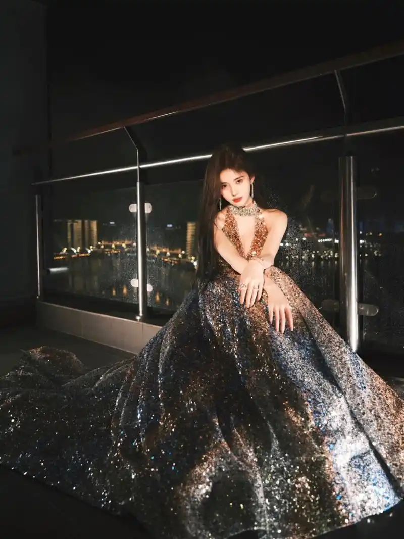 鞠婧祎红毯造型好美,一身金色流彩亮片礼服优雅高贵,女神范十足_设计